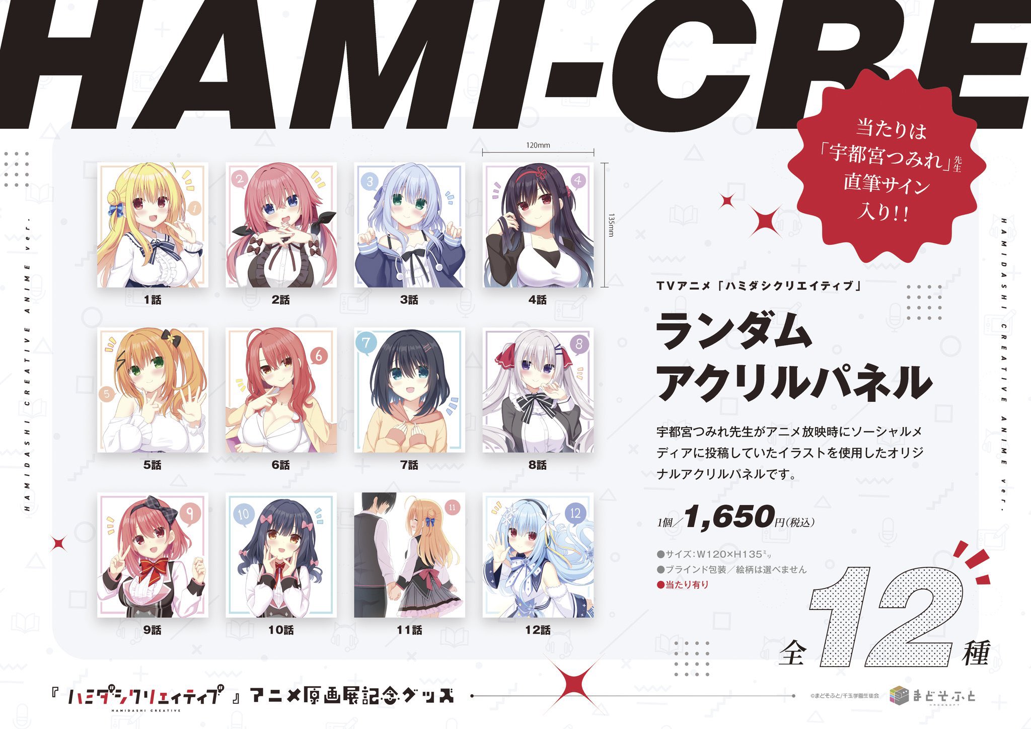 また、「まどそふとSHOP inソフマップ」の新規開催を記念して、ソフマップなんば店様にてTVアニメ「ハミダシクリエイティブ」アニメ原画展記念グッズとして発売したランダムアクリルパネルを再販します!