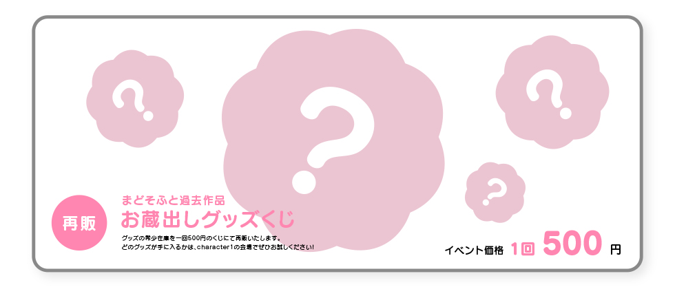 character1 2018oct. [開催日] 2018年10月14日(日) [時間] 11:00~17:00 [会場] 東京国際展示場(東京ビッグサイト)西2ホール [ブースNo.] 110 [ブース名] まどそふと [公式ページ] http://http://www.character1.jp/oct/index.html/ |