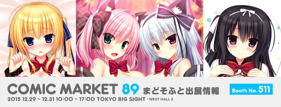 コミックマーケット89 [開催日] 2015年12月29日(火)・30日(水)・31日(木) [時間] 10:00~17:00(最終日は16:00まで) [会場] 東京国際展示場(東京ビッグサイト)西3ホール [ブースNo.] 511 [ブース名] まどそふと&NanaWind [公式ページ] http://www.comiket.co.jp/ |