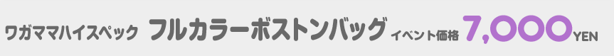 ワガママハイスペックより「フルカラーボストンバッグ」が初登場! 普段使いが出来るデザインで実用度もバッチリ! [商品名] フルカラーボストンバッグ [サイズ] 約H23cm×W45cm×D23cm [イベント価格] 7000円(税込) [初出] C91 ※画面環境などによっては実際の商品と色味が異なる場合があります |