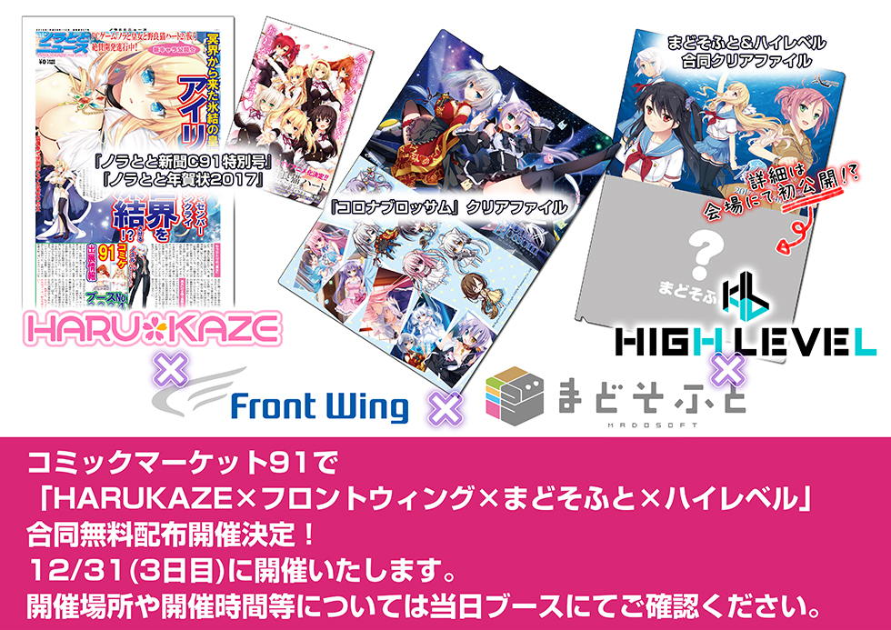 コミックマーケット91 [開催日] 2016年12月29日(木)~12月31日(土) [時間] 10:00~17:00(31日は16:00まで) [会場] 東京国際展示場(東京ビッグサイト)西4階 [ブースNo.] 3331 [ブース名] まどそふと&ハイレベル [公式ページ] http://www.comiket.co.jp/ |