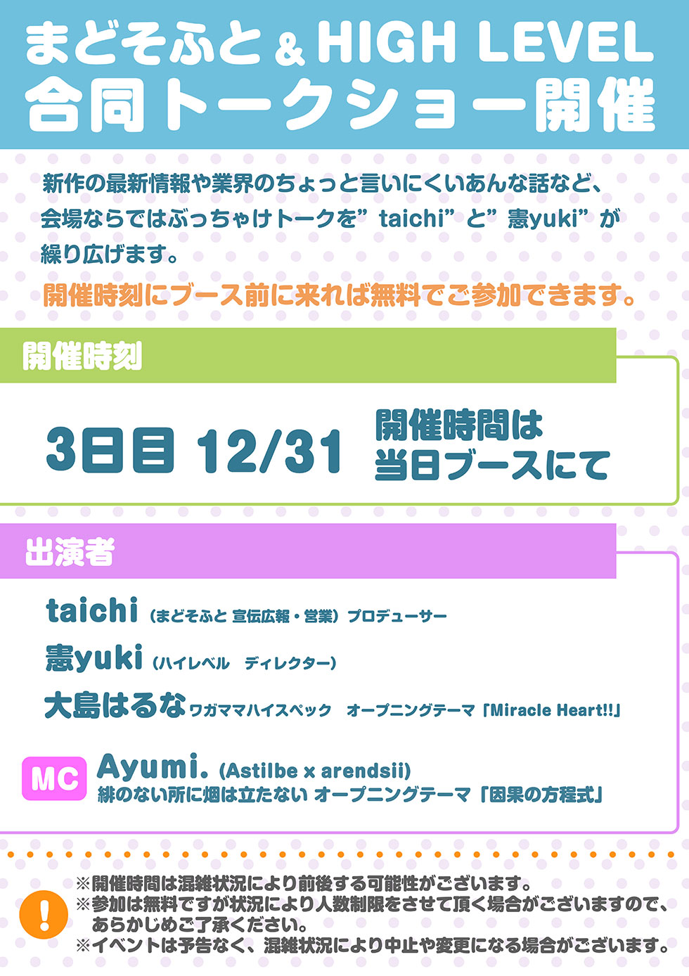 ● コミックマーケットでは徹夜が禁止されております。始発からのご来場をお願いします。