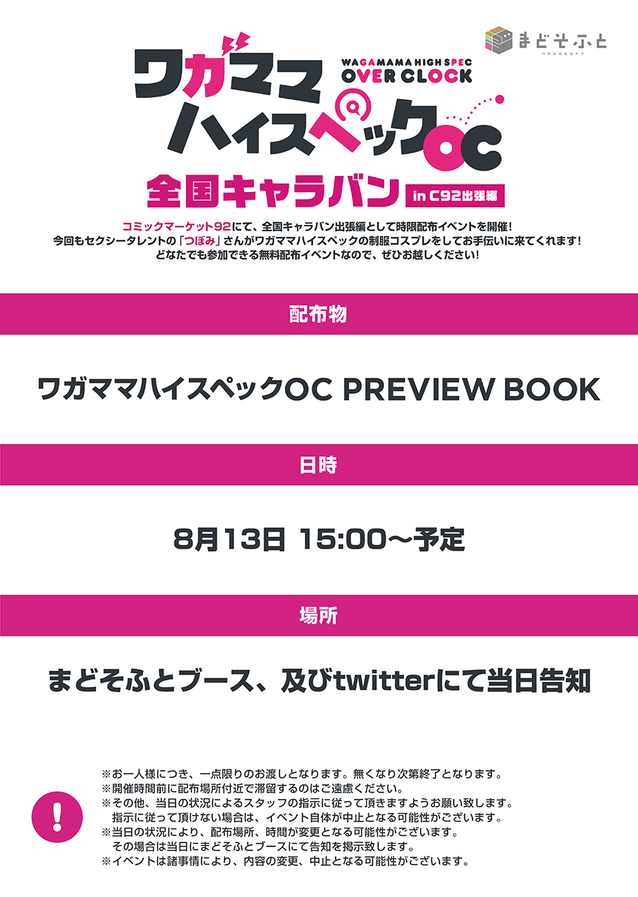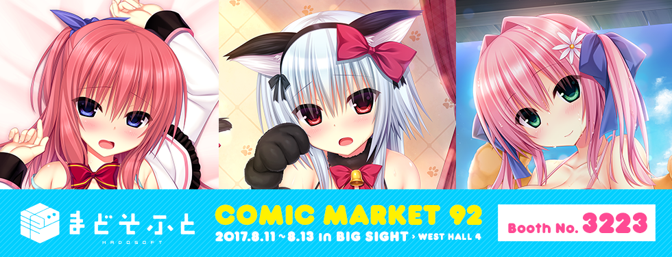 ● 正式名称 コミックマーケット92 ● 開催日程 2017年8月11日(金)~8月13日(日) ● 開催時間 10:00~17:00(3日目の8月13日は16:00まで) ● 開催場所 東京国際展示場(東京ビッグサイト)西4階 ● ブースNo. 3223 ● ブース名 まどそふと ● イベント公式ページ http://www.comiket.co.jp/ |