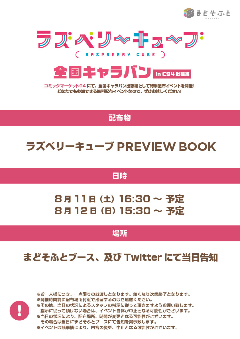 ● 正式名称 コミックマーケット94 ● 開催日程 2018年8月10日(金)~8月12日(日) ● 開催時間 10:00~17:00(3日目の8月12日は16:00まで) ● 開催場所 東京国際展示場(東京ビッグサイト)西4階 ● ブースNo. 3212 ● ブース名 まどそふと ● イベント公式ページ http://www.comiket.co.jp/ |