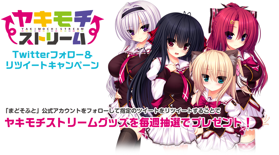 「まどそふと」公式アカウント(@madostaff)をフォローして、指定されたツイートをリツイートすることで、ヤキモチストリームグッズを毎週抽選でプレゼント致します!